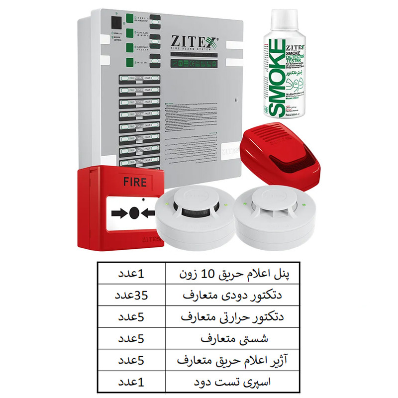 این پک شامل 1 دستگاه پنل اعلام حریق 10 زون برند زیتکس و 35 عدد دتکتور دودی برند زیتکس و 5 عدد دتکتور حرارتی زیتکس و 5 عدد شستی و 5 عدد آژیر فلاشر و 1 عدد اسپری تست دود زیتکس می باشد.