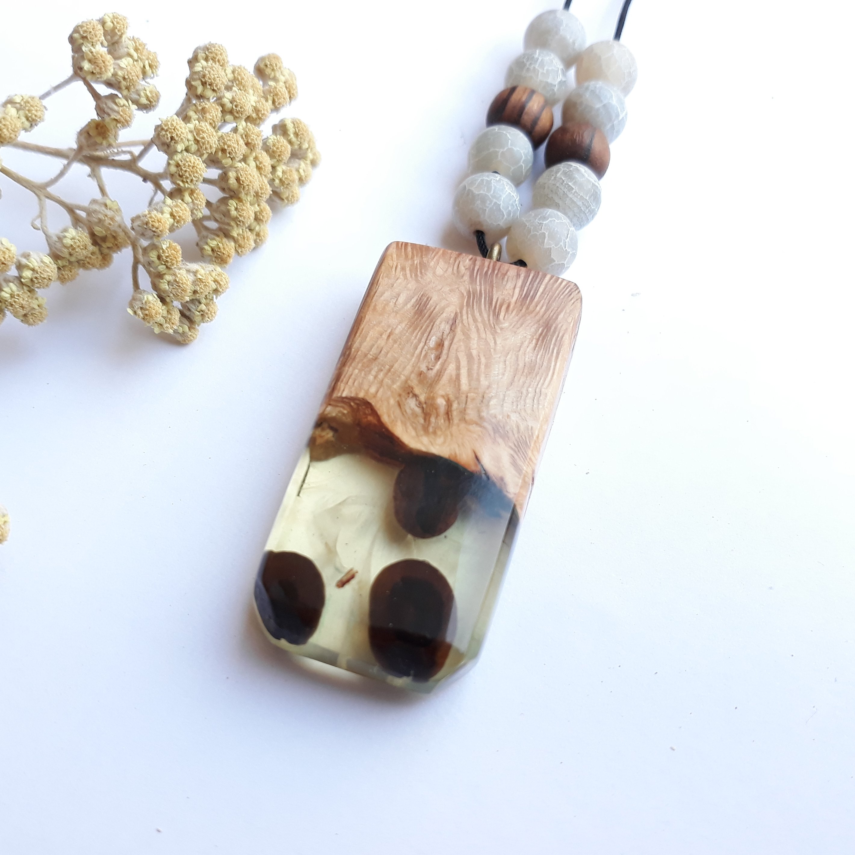 گردن اویز ترکیبی چوب و رزین اپوکسی شفاف و دانه قهوه تولید کاملا به وسیله دست که به دقت و حوصله بالا تمام مراحل ساخت ان انجاممیگردد که در بند ان مهرهای چوبی و سنگ عقیق خاکستری به کار رفته است که از خاصیتهای سنگ عقیق که از دیر باز سنگ مقدسی شمرده میشده است و ان راحامی انسان در مقابل بلایا و حوادث به ویژه در جنگ ها می دانستند وبرای افزایش در امد و رونق کسب و کار و اسان شدن کارها بسیار مفید است و برای تقویت نقاط مختلف بدن و برقراری تعادل و هماهنگی در آن ها بسیار مفید است و بنا به تناسب رنگی موجود در کار بین گردن اویز و سنگ ها و مهره های چوبی و نخ مشکی رنگ ان کاری خاص و تک به وجود اورده است