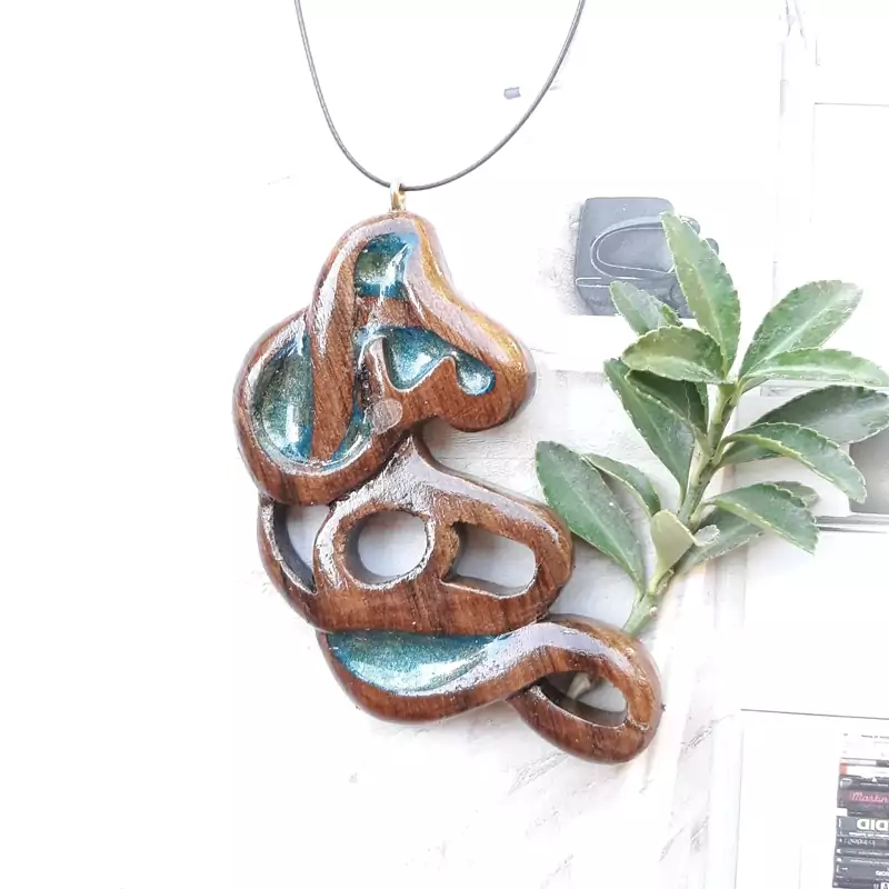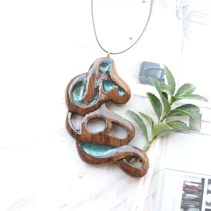 اسم مهسا ساخته شده از چوب گردو ترکیب با رزین فیروزه ای معرق منبت شده دستساز چوبکده بیدسفید