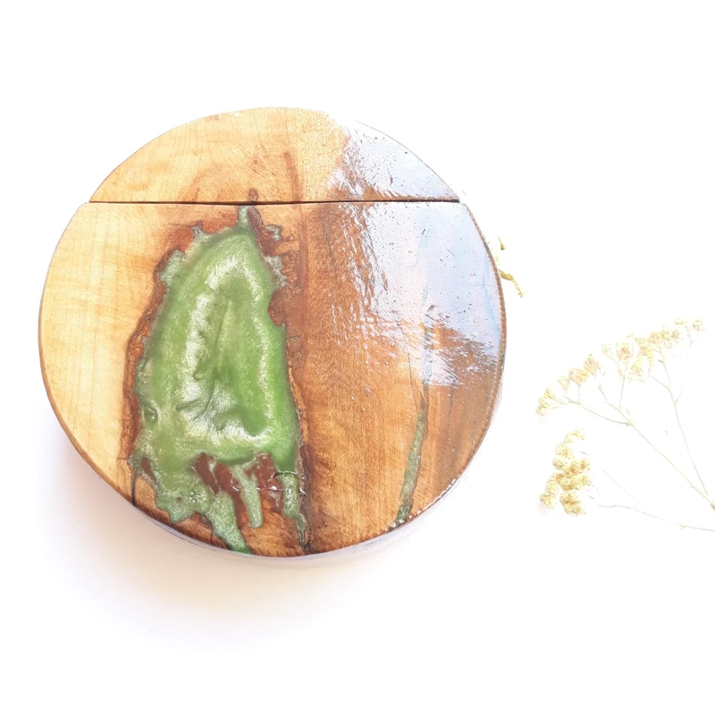 جعبه ای کاملا خاص و منحصر به فرد از چوب کیکم که ترکیب زیبا از چوب و هنر رزین اپوکسی میباشد که با توجه به تنالیته رنگی چوب و رنگ سبز بکار رفته بسیار بسیار زیباست
