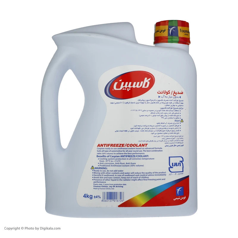 ضدیخ کاسپین مدل کولانت 50/50 حجم 3.86 لیتری جزء بهترین ضدیخهایی است که میتوانید برای خودروی خود تهیه کنید. ترکیبات موجود در آن، این محصول را مجهز به خواص فوق العاده ای از جمله ضد خوردگی، ضد زنگ و ضد رسوب کرده است. محدوده دمایی وسیعی که این ضدیخ مرغوب پوشش می دهد موجب می شود از این محصول در تمام فصل های سال به راحتی استفاده کنید. این ضدیخ نیاز به ترکیب شدن با آب ندارد. از لحظه ای که درب آن را باز کنید، آماده مصرف است. در سردترین نقاط کشور که باشید می توانید از خواص ویژه این ضدیخ بهره مند شوید. محافظت دمایی ضدیخ کاسپین مدل کولانت بین منفی 37 درجه سانتی گراد تا مثبت 112 درجه سانتی گراد است. ضدیخ کاسپین مدل کولانت 50/50 حجم 3.86 لیتری دارای ویژگیهای منحصر به فردی است: رادیاتور خودرو از زنگ زدگی، رسوب، خوردگی و خورندگی در امان می ماند. مطابق با استاندارد ملی ایران به شماره 338 تولید شده است و برای استفاده در خودروهای داخل کشور مناسب است. در فصل تابستان به عنوان مایع ضد جوش و خنک کننده موتور خودرو عملکرد فوق العاده ای دارد. با ترکیباتی که دارد از آسیب ها و هزینه های گزاف تعمیر خودرو جلوگیری می کند. با تمام این توصیفات، استفاده از این ضدیخ بسیار به صرفه است.