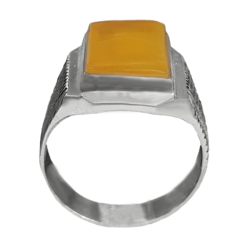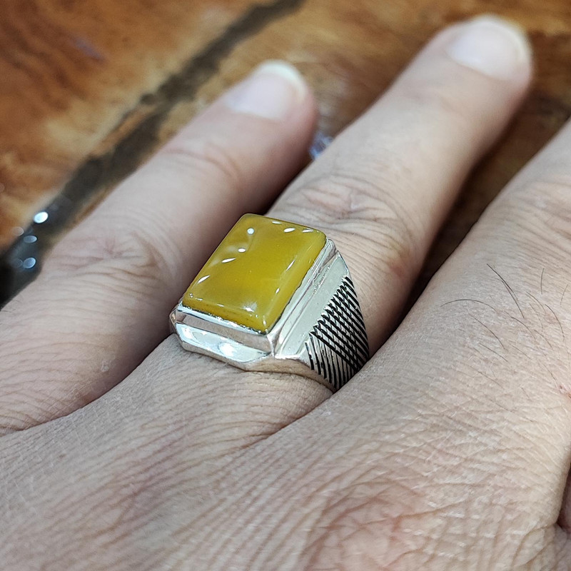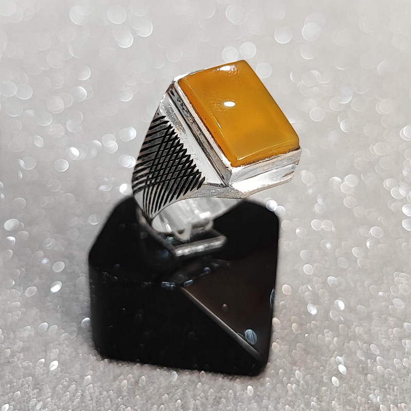 این انگشتر با نقره عیار 925 بالاترین عیار تزیینات نقره ساخته شده است. رکاب انگشتر دست ساز است و طراحی آن ترکیبی از هنر سنتی و مدرن میباشد و خطوط حکاکی شده روی بازوی رکاب به طرح کج راه معروف میباشد که جزو پر طرفدارترین مدلهای انگشتر نقره میباشد. نگین انگشتر سنگ طبیعی عقیق شرف الشمس کار شده است و زیر عقیق حرز امام جواد ع روی پوست آهو بکار رفته است ازینرو دارای خواص معنوی شناخته شده بسیاری است. طراحی این انگشتر مناسب با سلیقه آقایان شیک پوش و ستهای کلاسیک و اسپرت ساخته شده است.